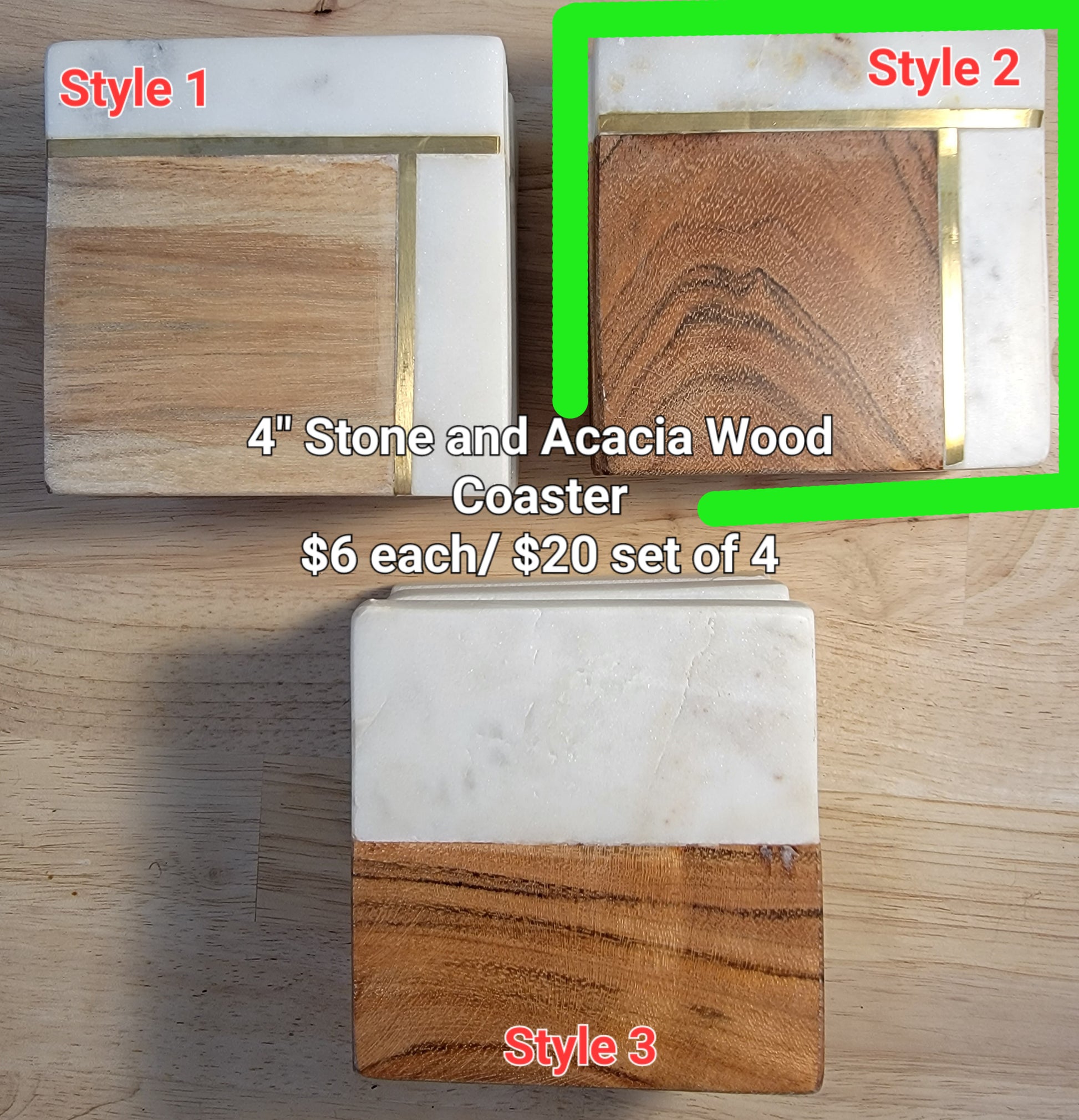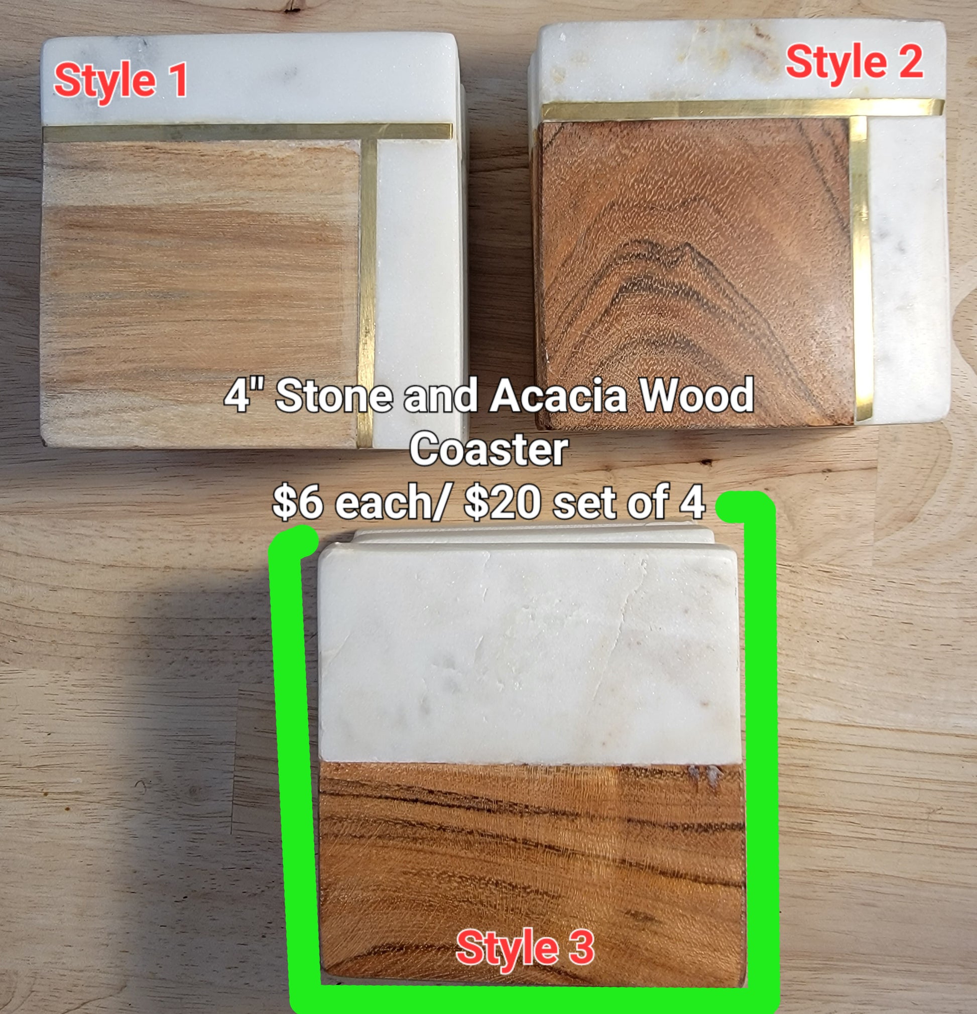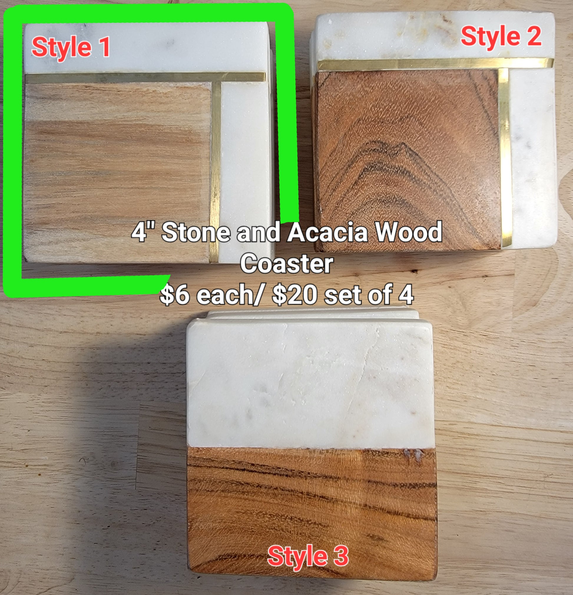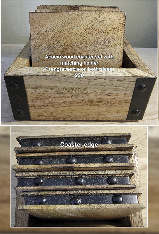 *Types of wood: Acacia, Bamboo, Rubberwood, Olive, Teak. Some boards/ coasters feature acacia/ marble combinations. Colors range from light to dark. Some boards can be stained with color, if desired.