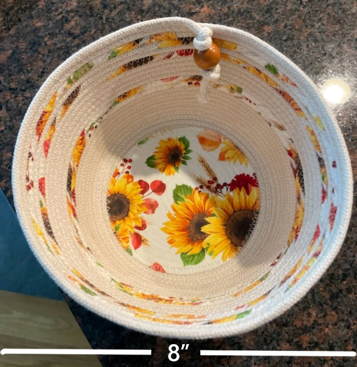 Most of my art is made with 100% braided cotton rope made right here in NC. One-of-a-kind baskets, trivets and wall art add new character and texture to your décor. Cotton does occasionally absorb humidity so if the shape changes, just spray it with water, tug and form it a bit and let it dry, or use a steam iron to flatten it if it curls.