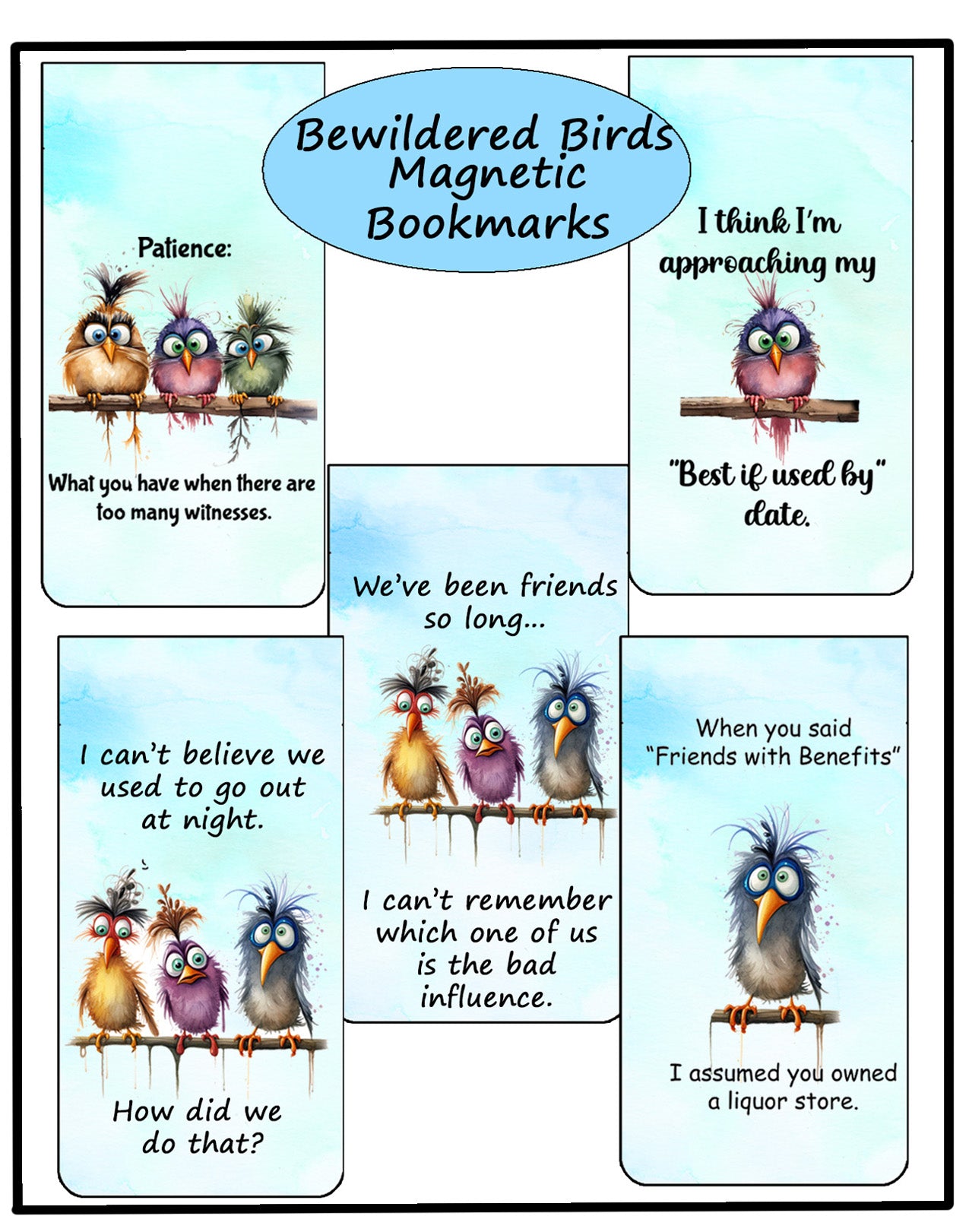 Collection of funny Bewildered Birds sayings on magnetic bookmarks. In addition to the saying on the front, the back has a coordinating image. Inside the bookmark are two magnets that clip together to hold your page or pages as a place holder.