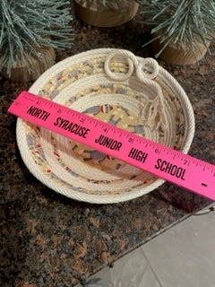 Most of my art is made with 100% braided cotton rope made right here in NC. One-of-a-kind baskets, trivets and wall art add new character and texture to your décor. Cotton does occasionally absorb humidity so if the shape changes, just spray it with water, tug and form it a bit and let it dry, or use a steam iron to flatten it if it curls.
