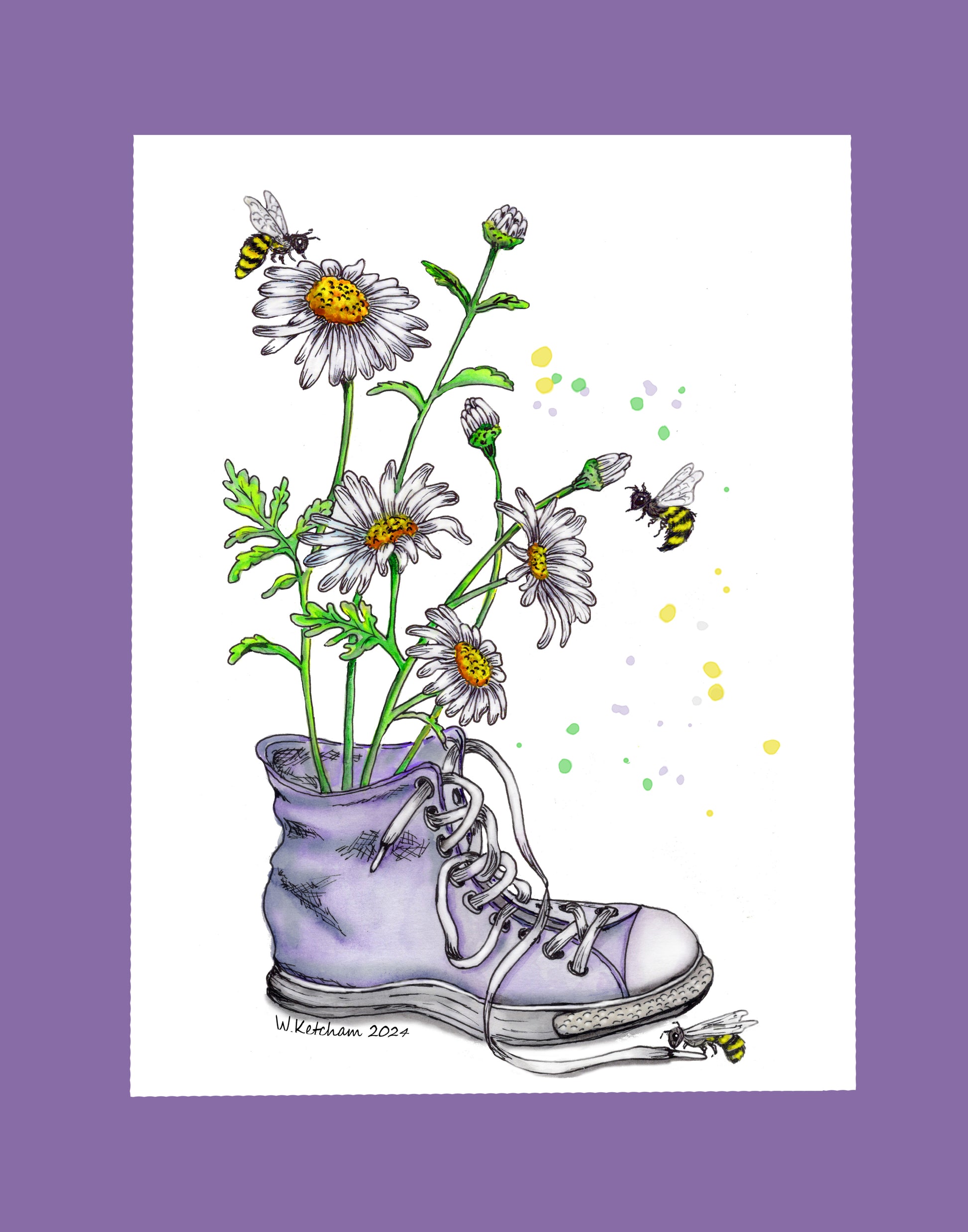 "Daisies and Bees" is printed on premium paper. It is part of the Shoes and Things collection.