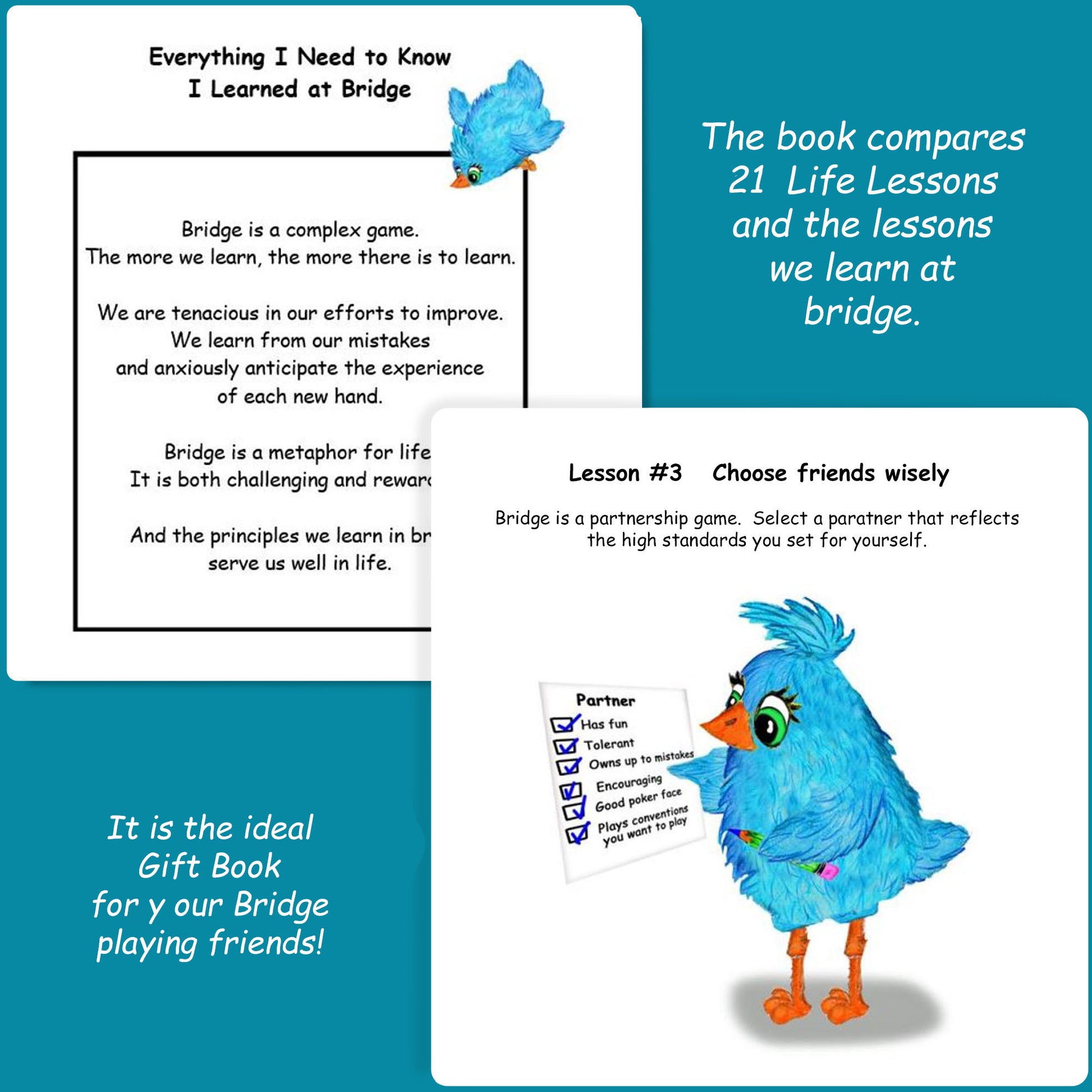 This delightful book examines 21 life principles learned by playing the game. Written by an avid Bridge player, it will resonate with Duplicate or Social Bridge players.