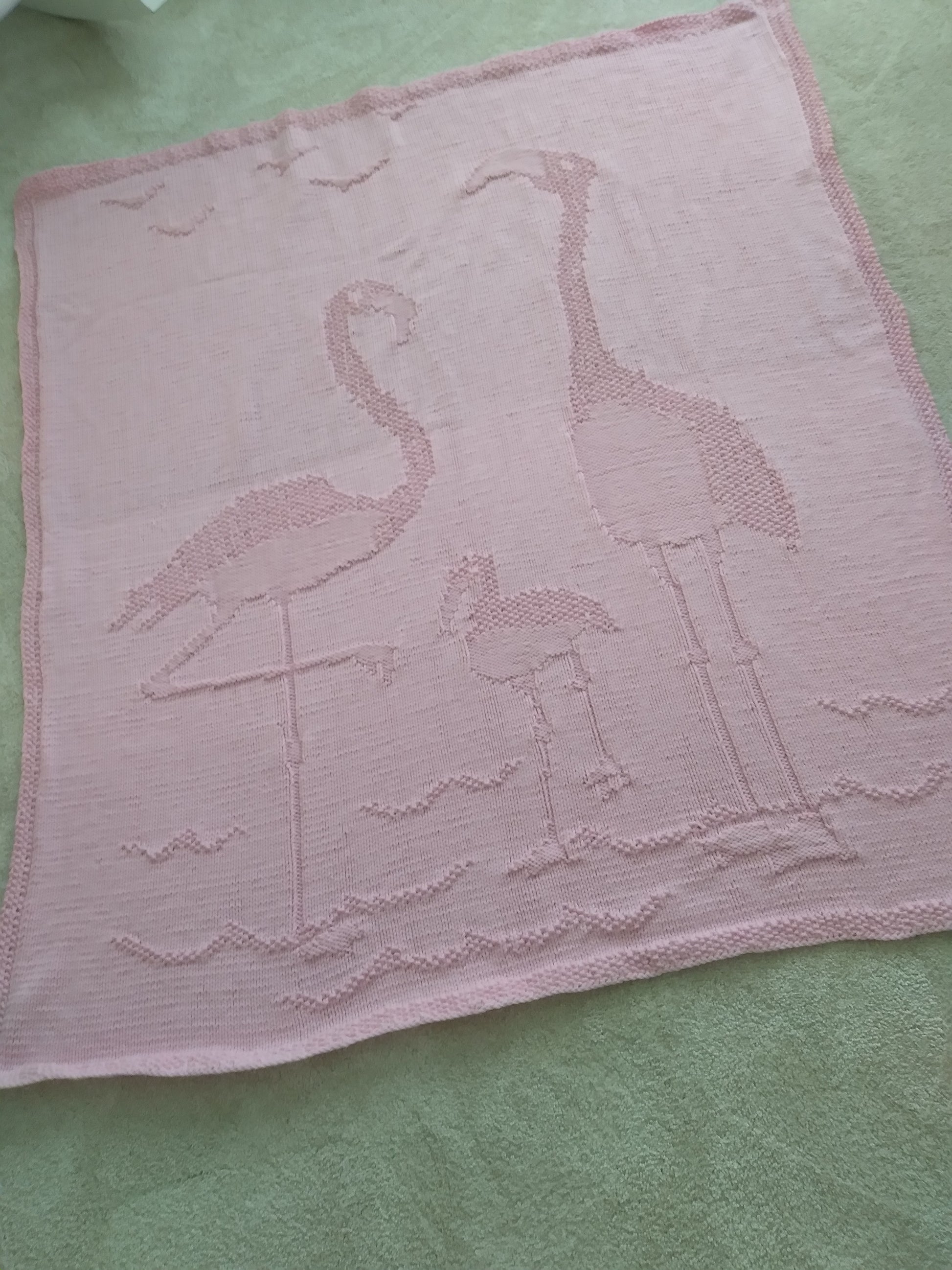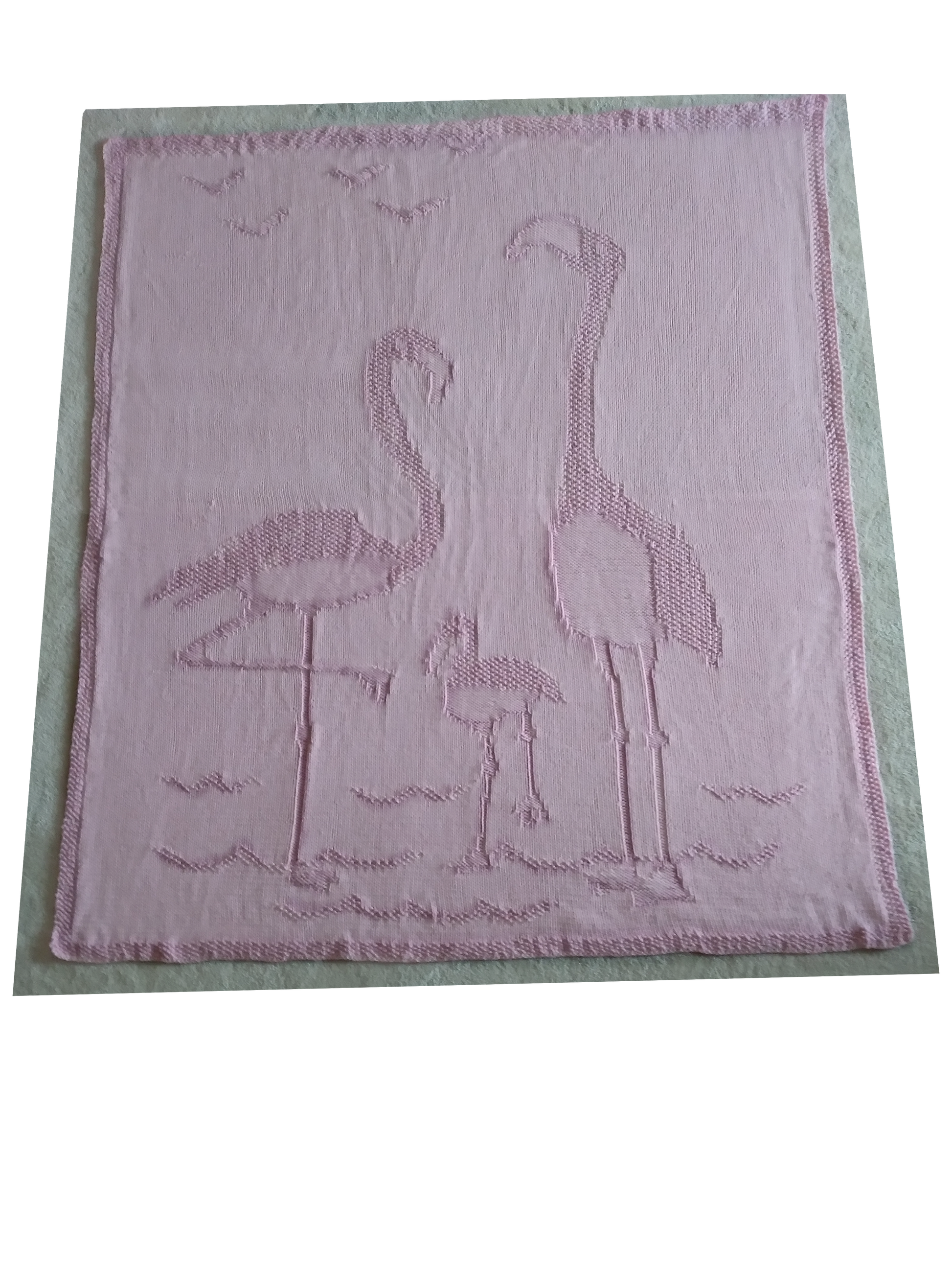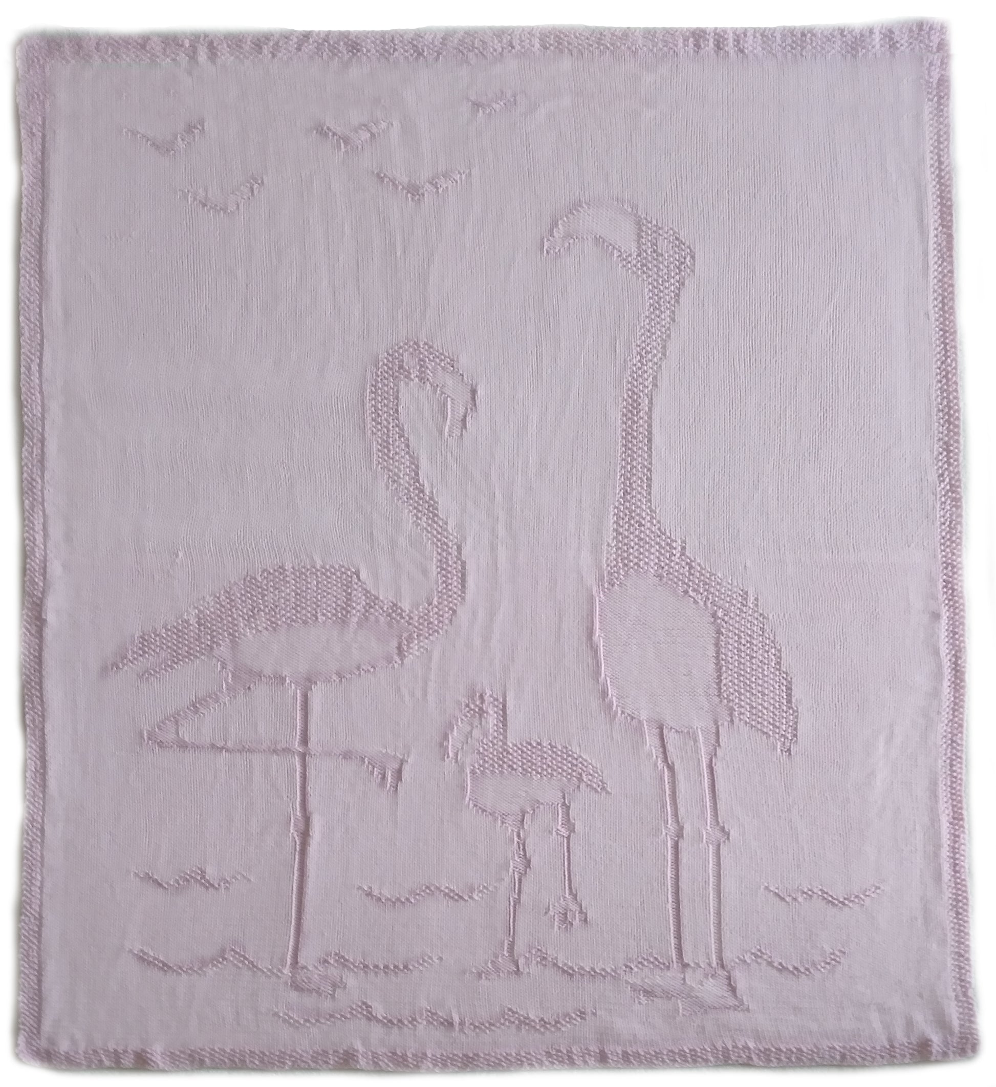 This knit pattern features a family of flamingos wading in the water. Three stitches used in this pattern; knit, purl, and seed stitch. The finished blanket has an embossed look and it is as adorable on the reverse side as on the front. It is fun to watch the image appear as you knit from bottom up.