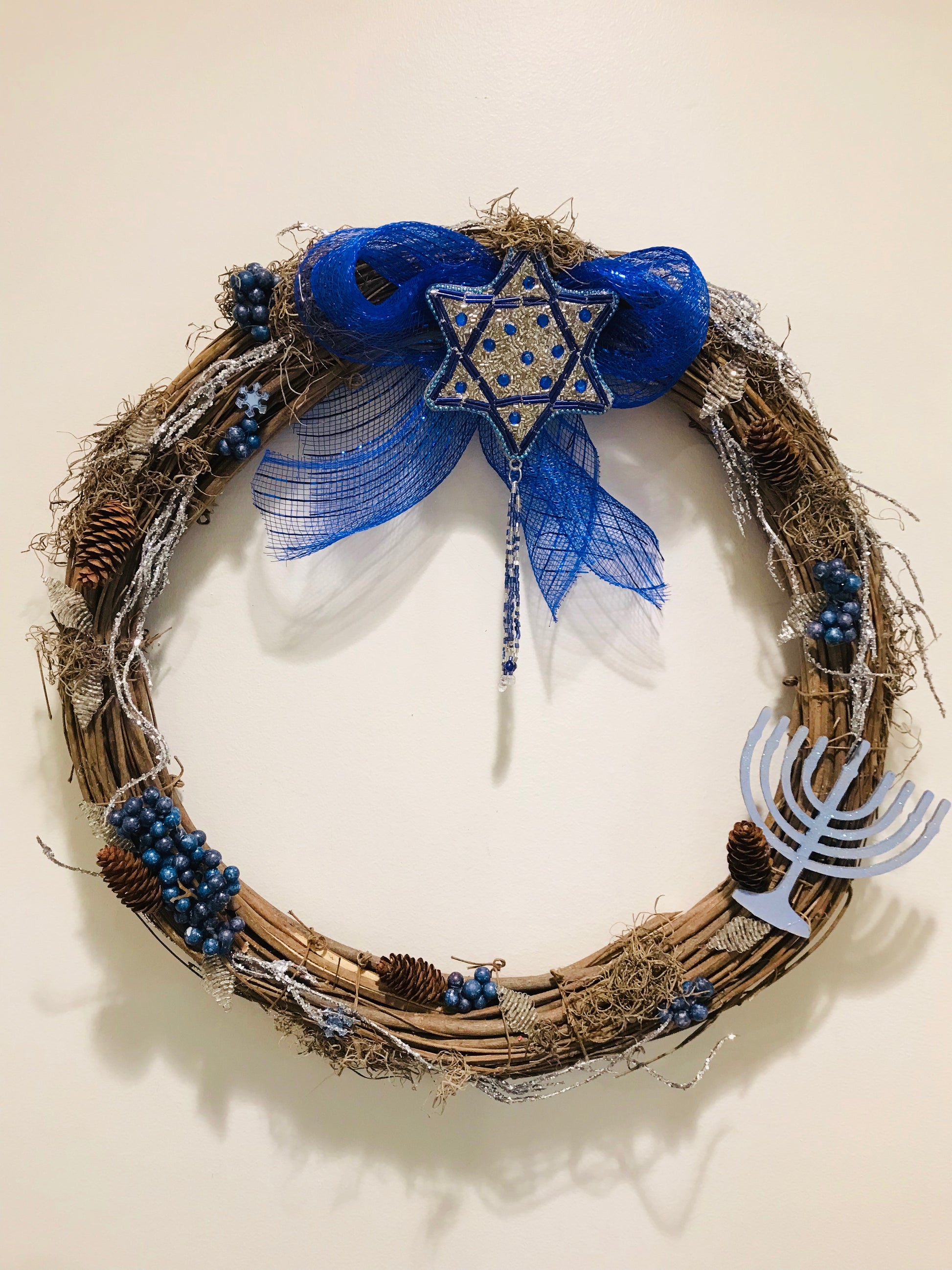 This special Hanukkah wreath is decorated with unique ornaments and lots of BLUE!