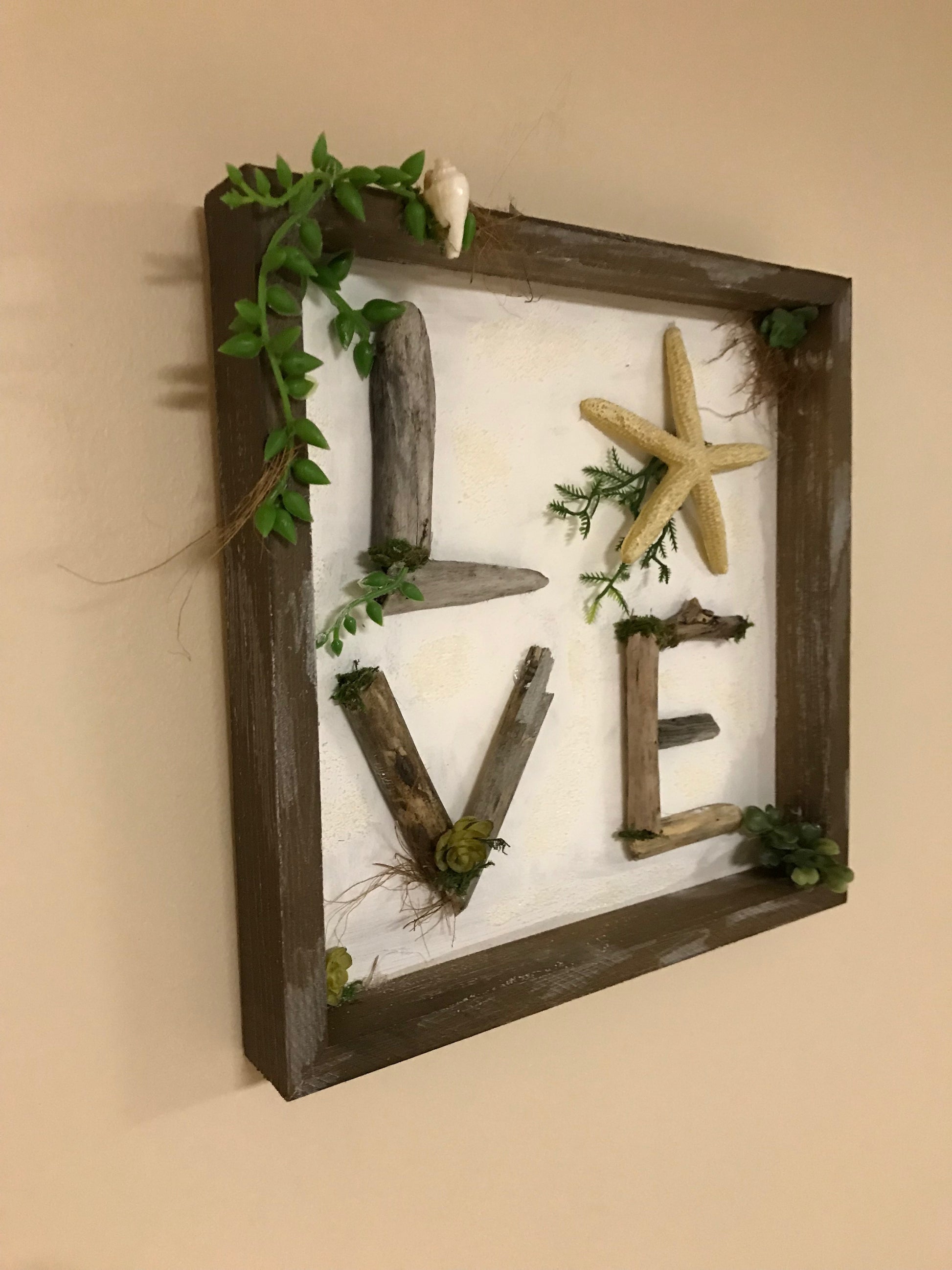 LOVE Starfish and Driftwood Sign is a cool framed tribute to all lovers of the beach. A coastal twist to the traditional LOVE sign, this 3D wall decor has natural and faux botanicals combined with driftwood to make you almost feel the ocean breeze.