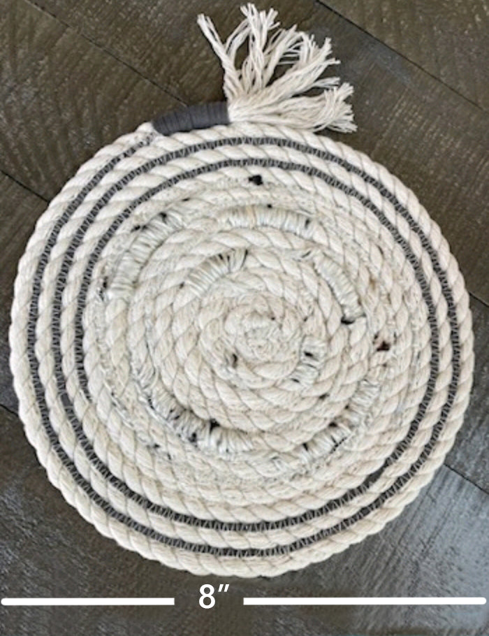 Most of my art is made with 100% braided cotton rope made right here in NC. One-of-a-kind baskets, trivets and wall art add new character and texture to your décor. Cotton does occasionally absorb humidity so if the shape changes, just spray it with water, tug and form it a bit and let it dry, or use a steam iron to flatten it if it curls.