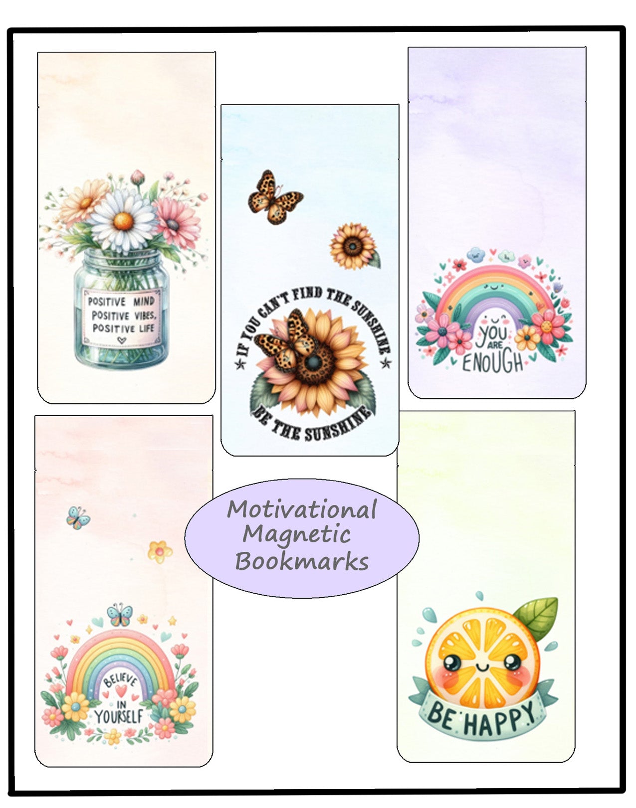 Collection of motivational sayings on magnetic bookmarks. In addition to the saying on the front, the back has a coordinating image. Inside the bookmark are two magnets that clip together to hold your page or pages as a place holder.