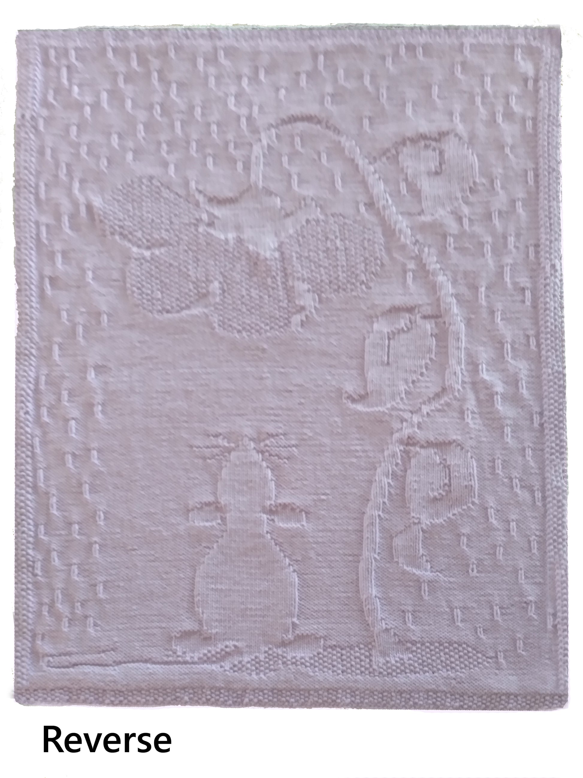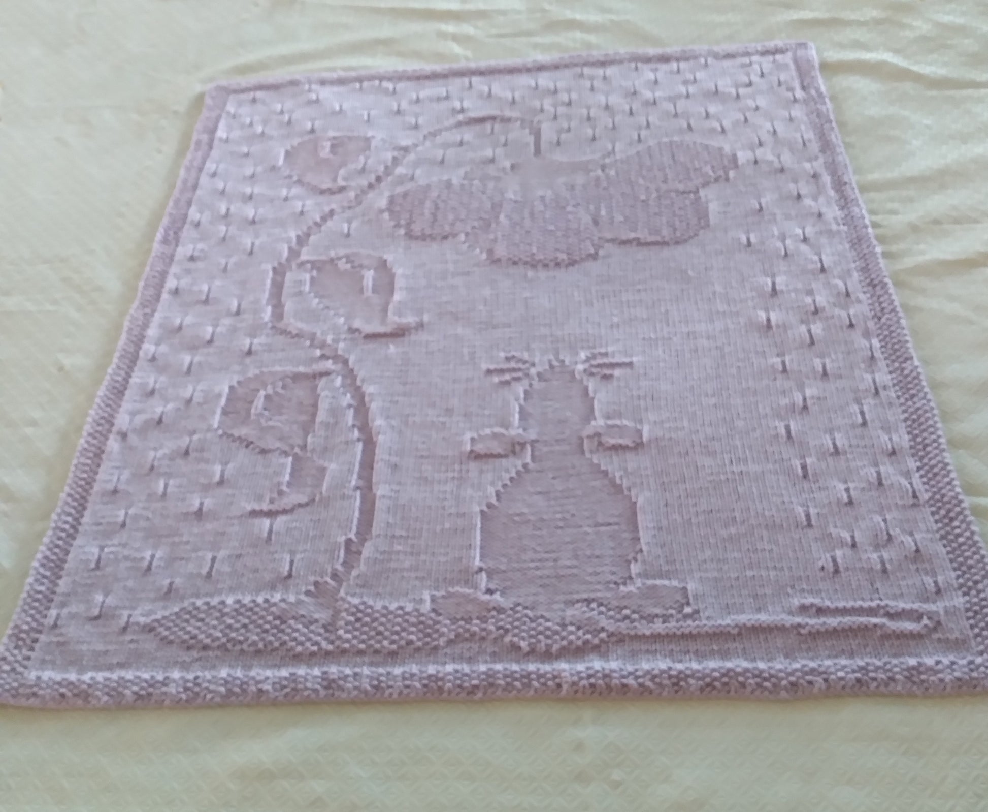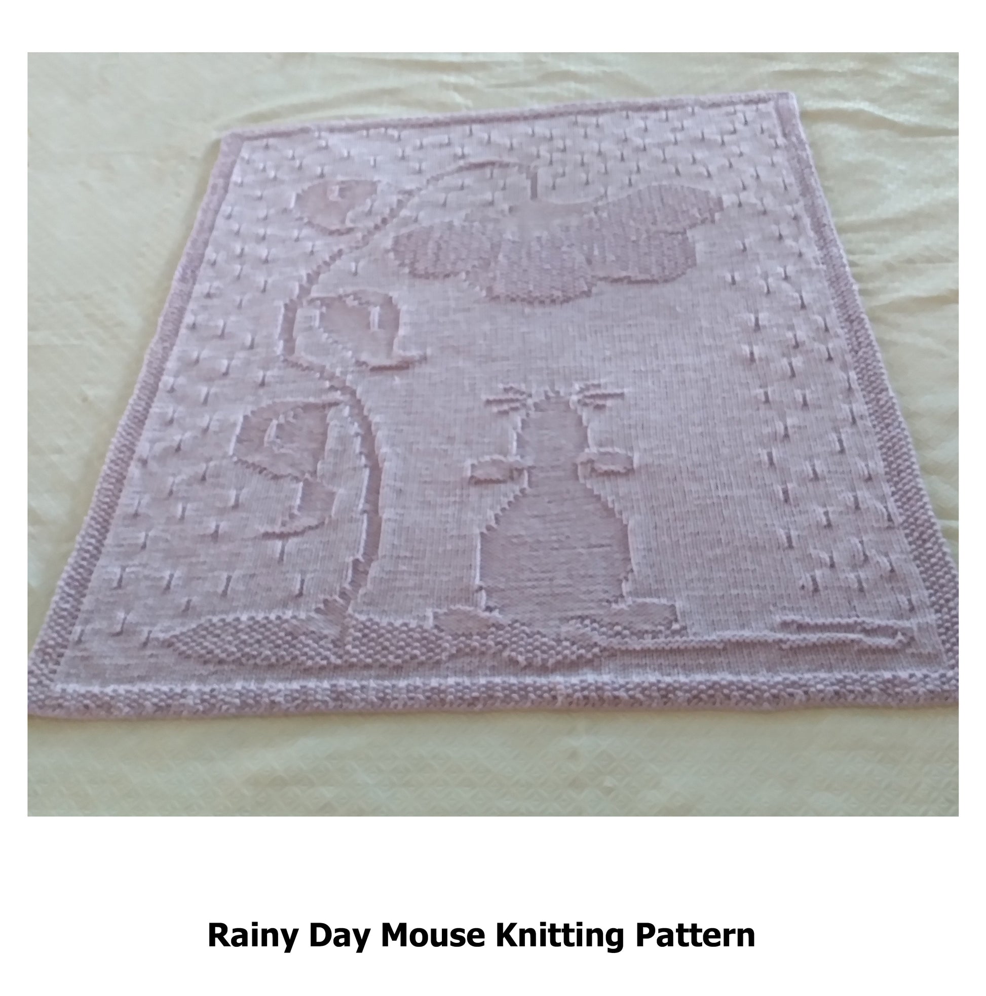 The pattern features a mouse seeking shelter from the rain under a generous flower. It takes approximately 2-3 skeins of acrylic yarn. The sample is made using "I Love This Yarn" Supersoft. Needle size is US 5 (3.75) Three stitches are used in the pattern; knit, purl, and seed stitch. Watch the image appear as you knit from the bottom up. The finished blanket has an embossed look and is as adorable on the reverse side as it is on the front.