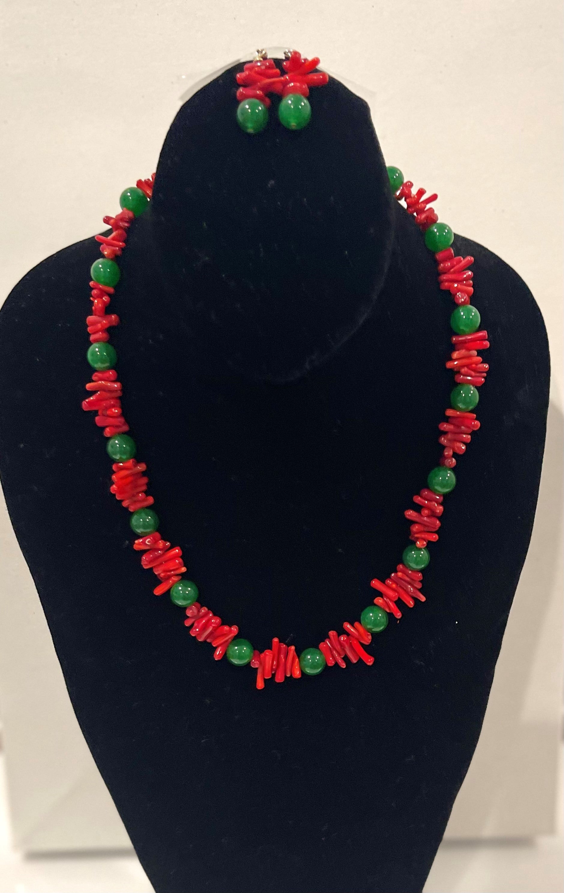 One of a kind ..... 20 inch red bamboo coral nuggets and green jade beads necklace with matching earrings