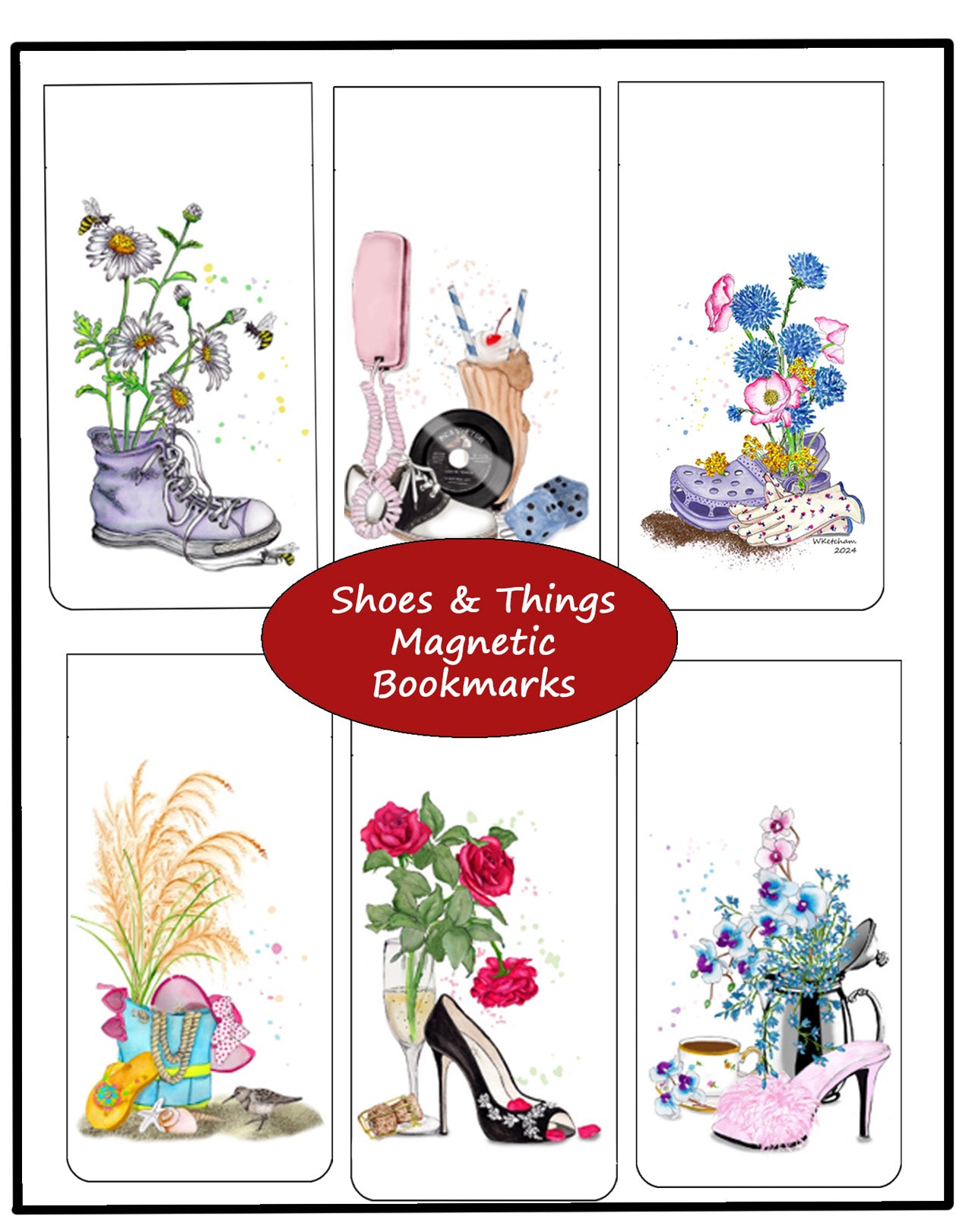 Collection of 6 images from the "Shoes and Things" artwork by Wanda Ketcham. Inside the bookmark are two magnets that clip together to hold your page or pages as a place holder.