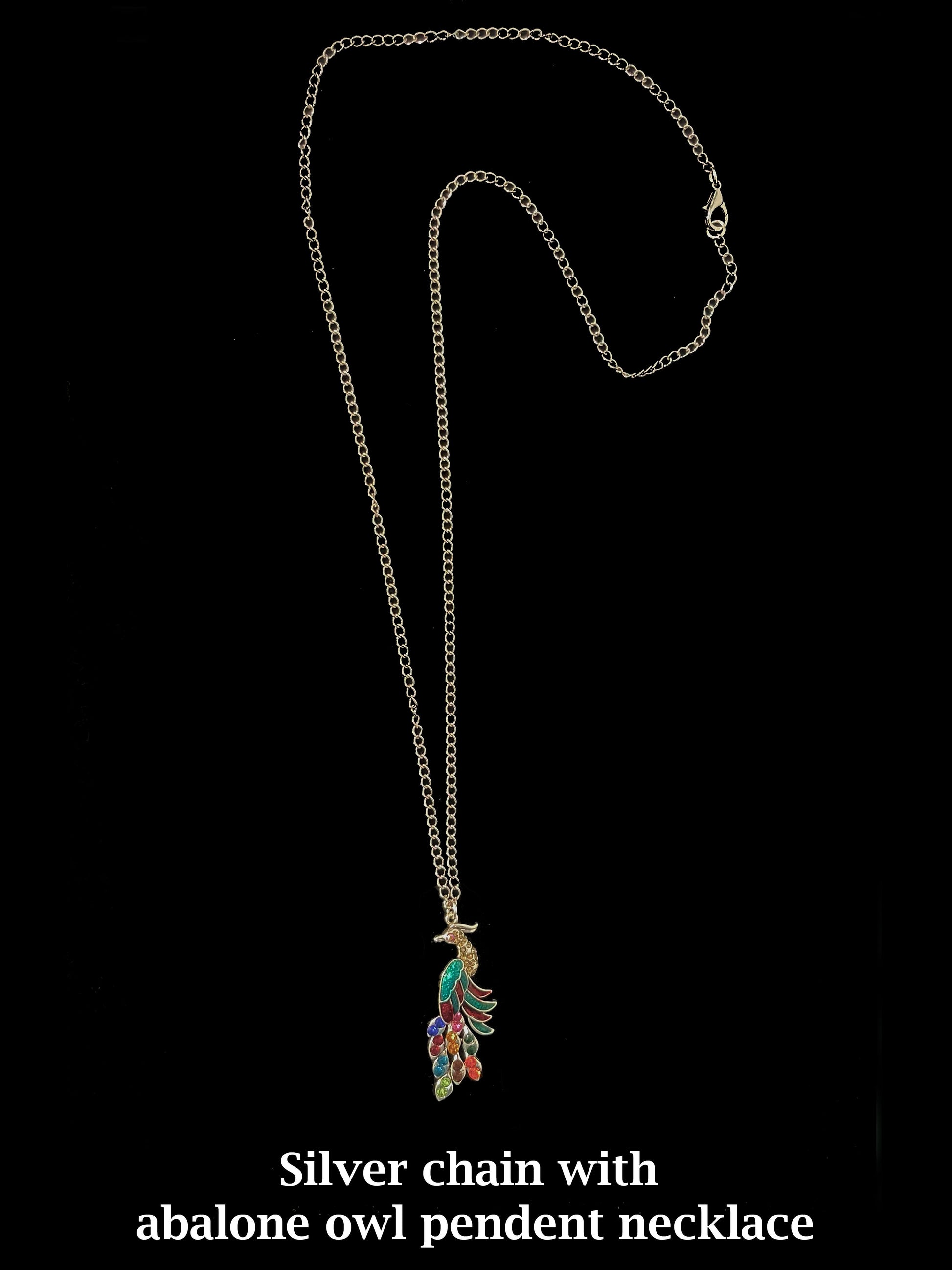 28 inch Stainless steel, 3 x 2 x 1 mm silver links, peacock pendant with multicolor CZ beads