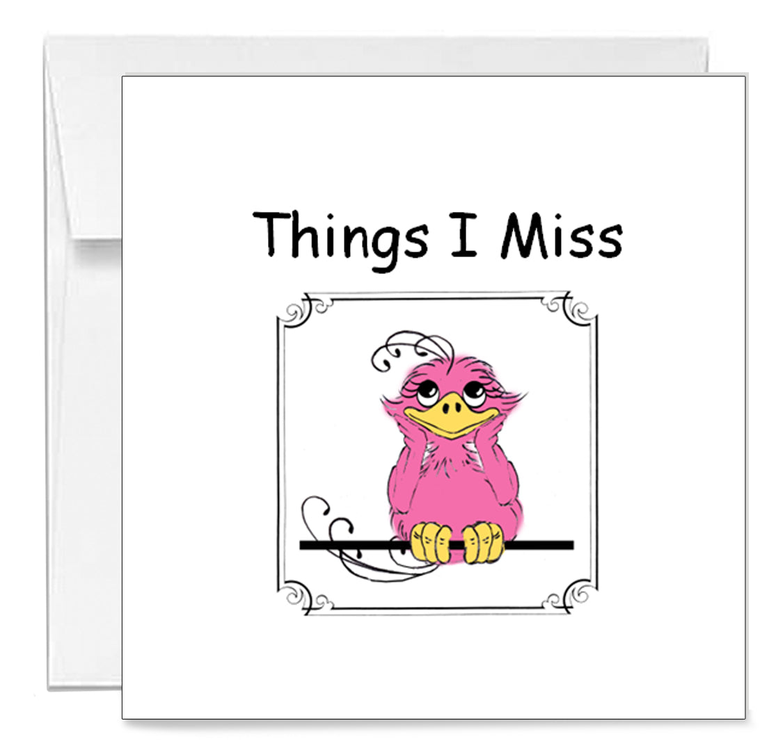 This book takes a humorous look at things that we miss from the past. Each page contains an image of something we miss (honest news reporting) and is paired with an amusing quote from a famous (and not-so-famous) source. A charming little bird stars in each of the images. The last page contains the most important thing we miss .... spending time with a good friend.