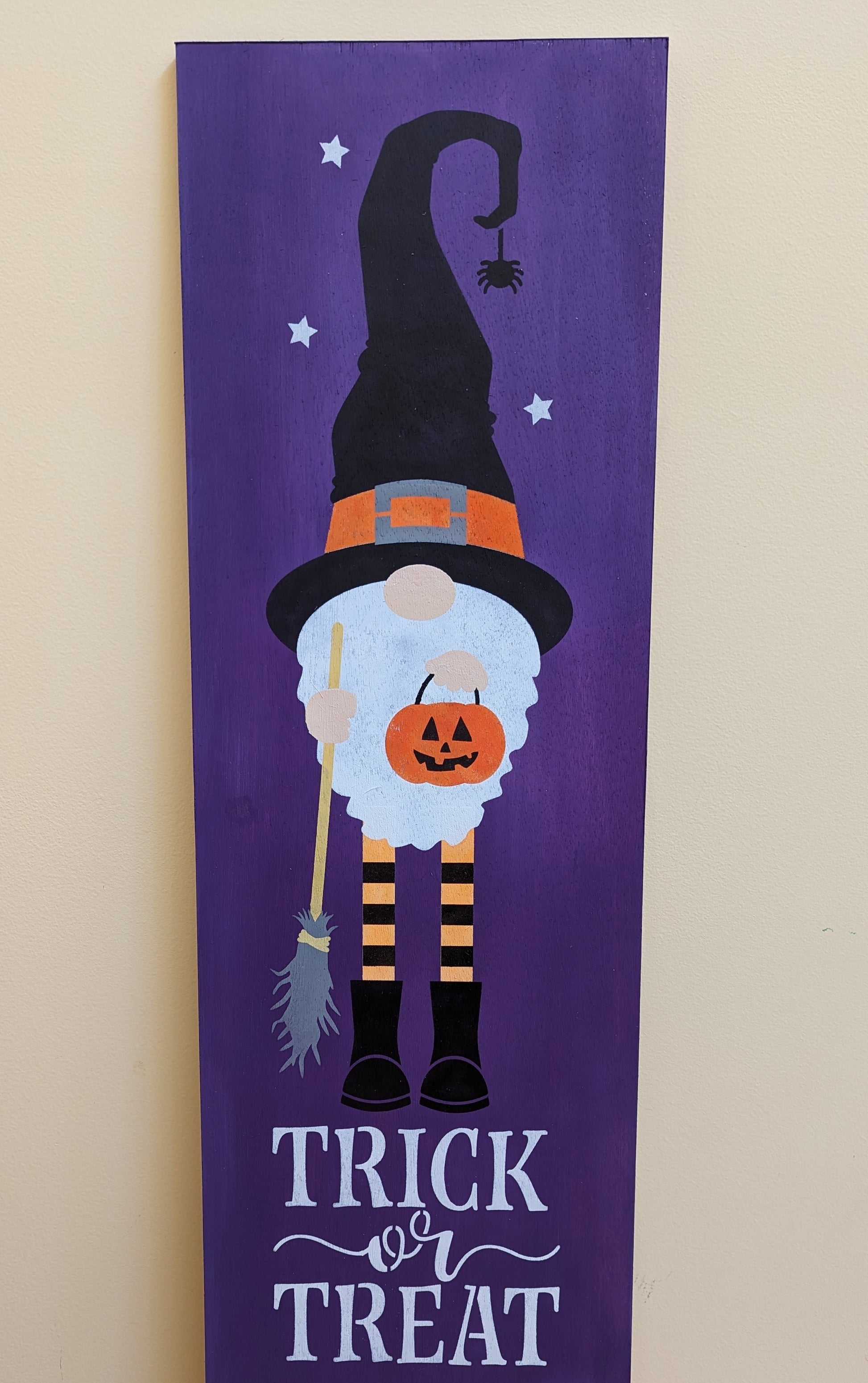 This 3 foot tall gnome can be placed outdoors to greet the children who visit on Halloween night!