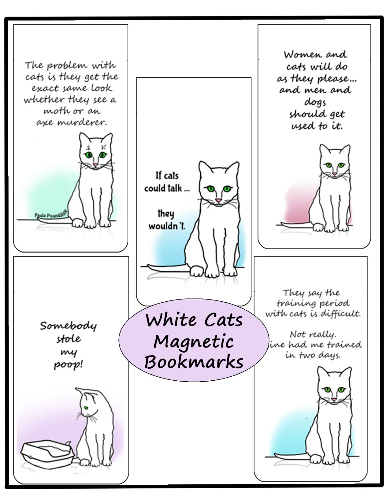 Collection of 5 White Cats with funny remarks on magnetic bookmarks. In addition to the funny saying on the front, the back has a coordinating image. Inside the bookmark are two magnets that clip together to hold your page or pages as a place holder.