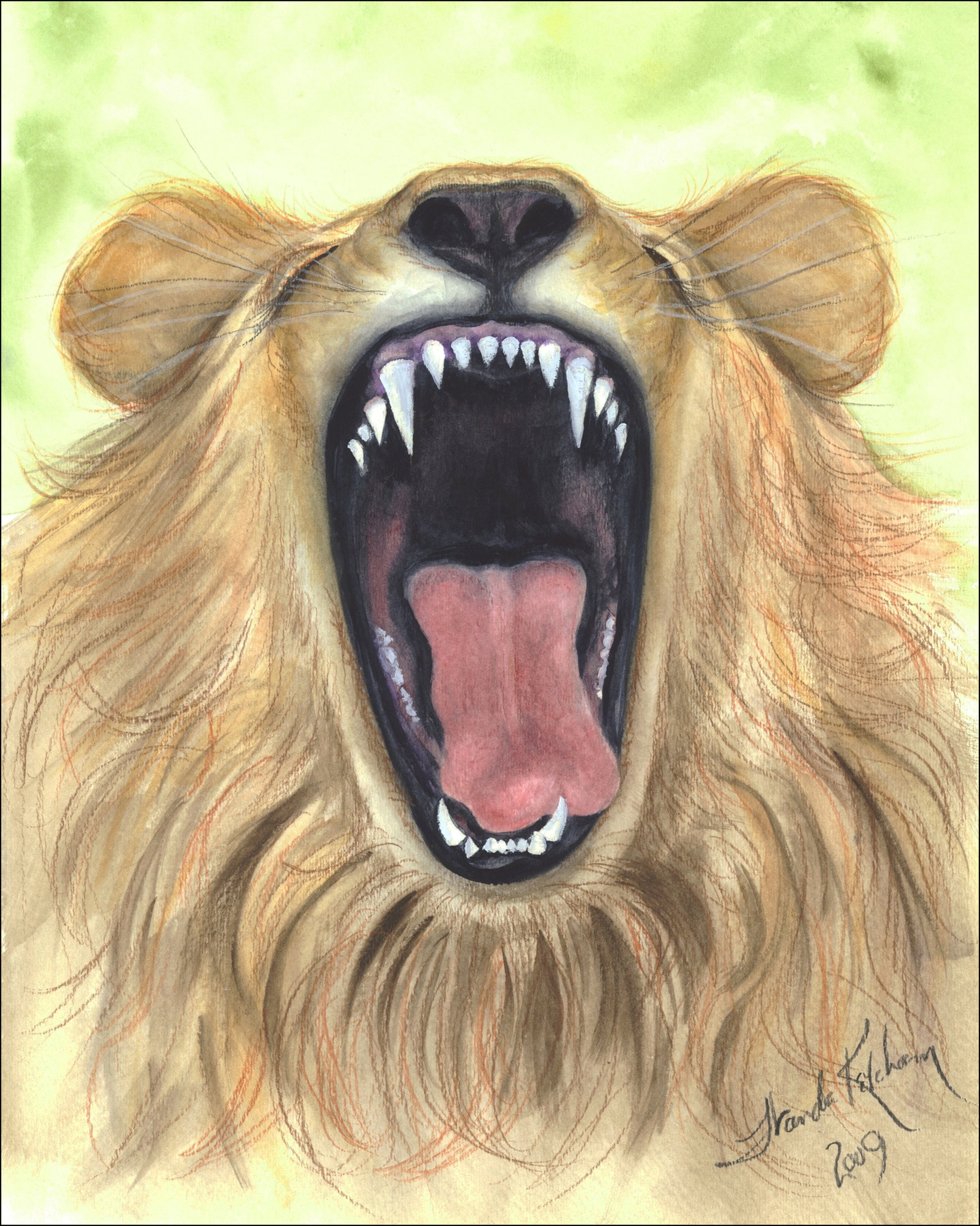 This lion has been caught yawning. Print is on premium paper. Original painting is a watercolor by Wanda Ketcham.